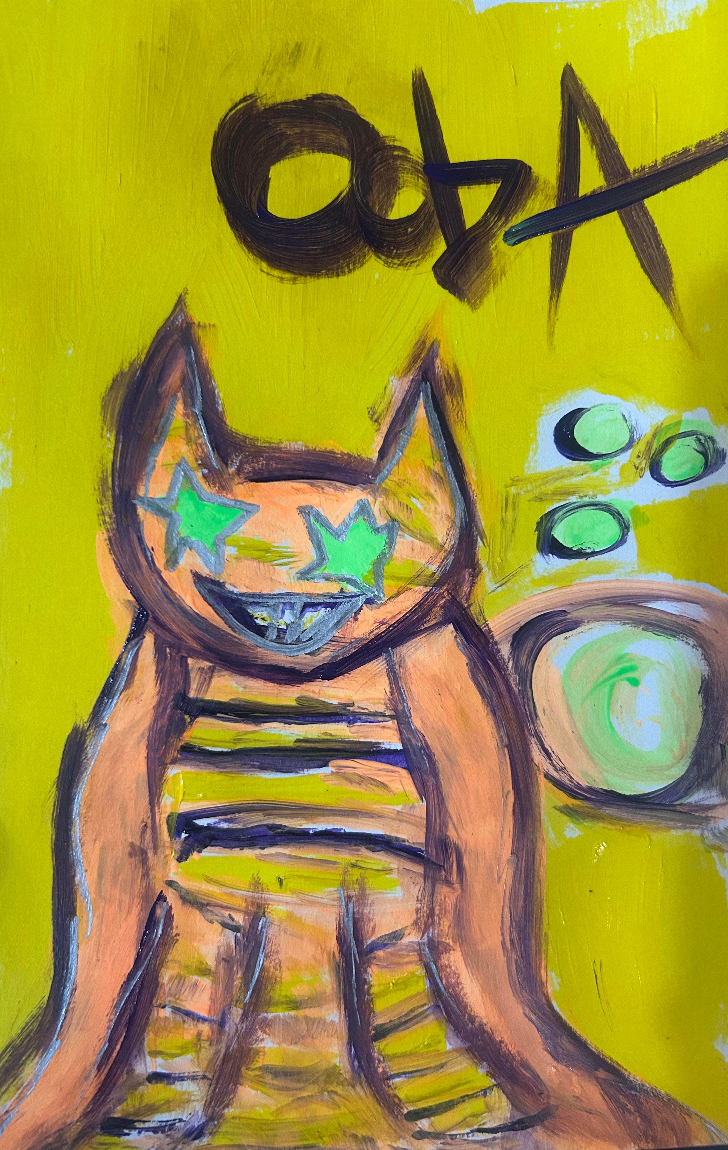 find this soft orange loaf looking creature with purple and yellow stripes and 2 lime green star shaped eyes.